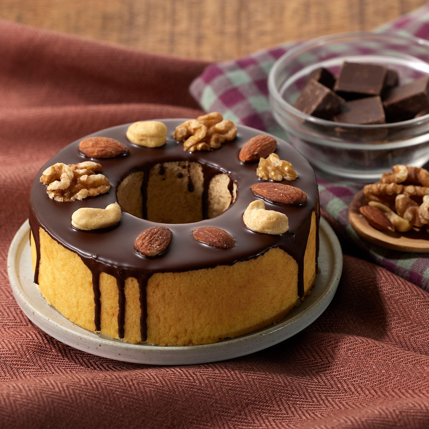 米粉配合のバウムクーヘンにチョココーティングとナッツをトッピングした贅沢なバウムクーヘン。