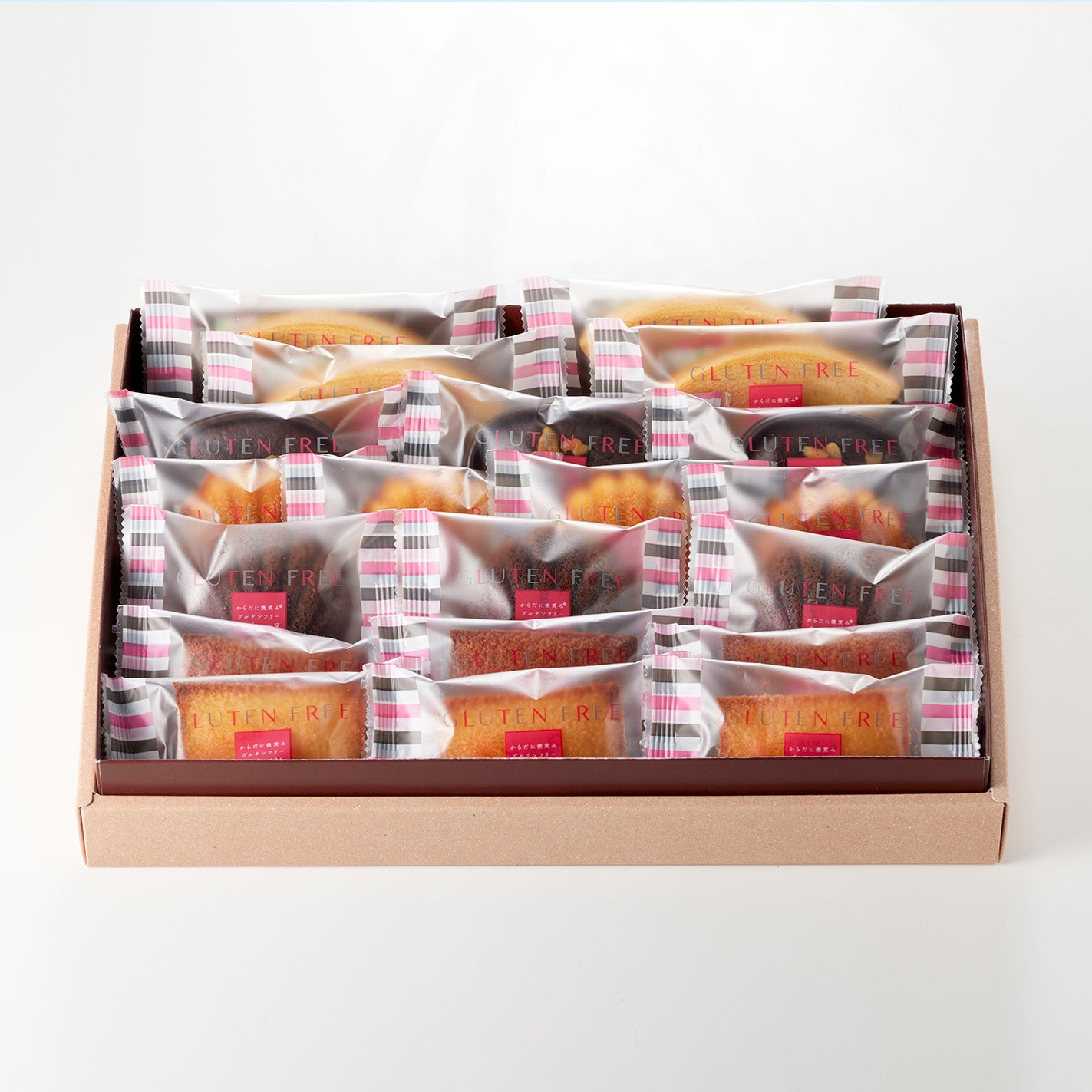 【商品内容】グルテンフリー(カットバウム・マドレーヌ)各4個、(チョコマドレーヌ・フィナンシェ・キャラメルフィナンシェ・ブラウニー)各3個